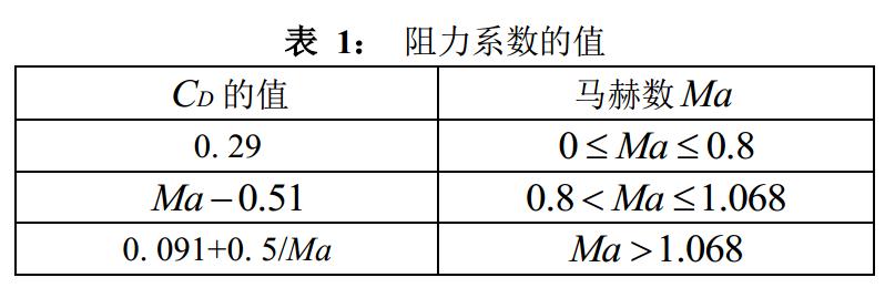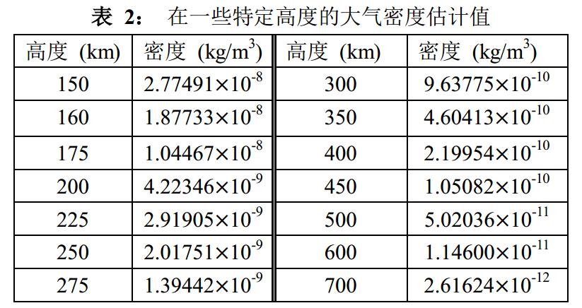 通過查閱相關參數數據得到衛(wèi)星質量m=13200kg, 并假設衛(wèi)星受阻面積為16m2, 對地軌道速度為7800 m/s, 即Ma= 22.9. 從表 1中我們可以得到相應的CD=0.11283. 從ρ(h)函數關系可以解出如下表所示的在一些特定高度的大氣密度估計值.
