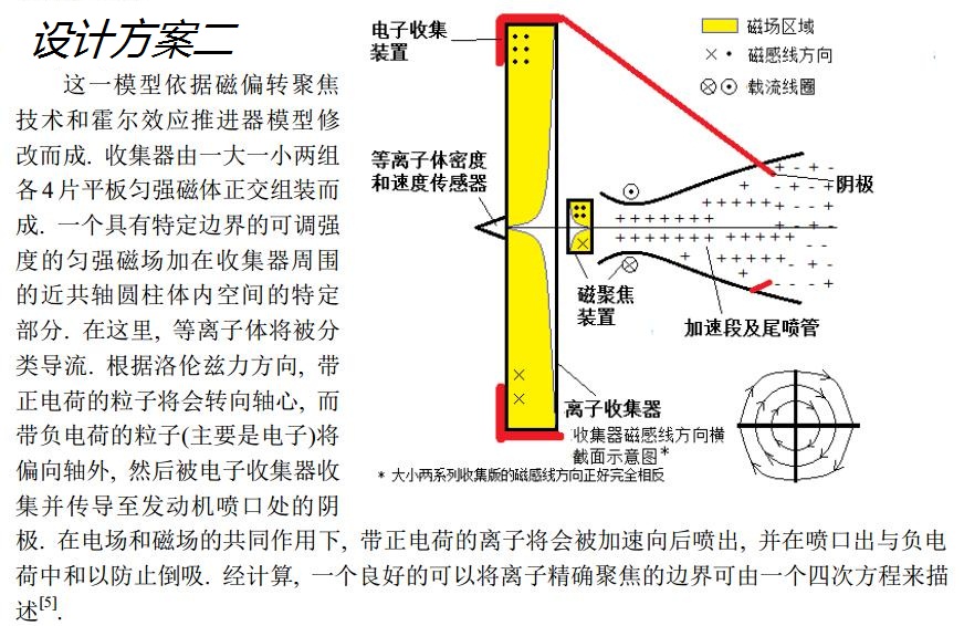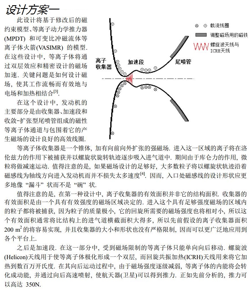 這一事實讓我想起了使用的離子推進器的衛(wèi)星, 如SMART和DAWN衛(wèi)星等. 離子推進器的廣泛應用說明了人類在短距離小空間內加速離子的技術日臻成熟. 這也同時讓我考慮到一個新的模型——融合傳統(tǒng)離子推進器和沖壓發(fā)動機的設計, 讓等離子體代替空氣進入進氣道, 然后使用電場和磁場來加速, 以取代化學燃料的燃燒. 這就是我的想法的概述.